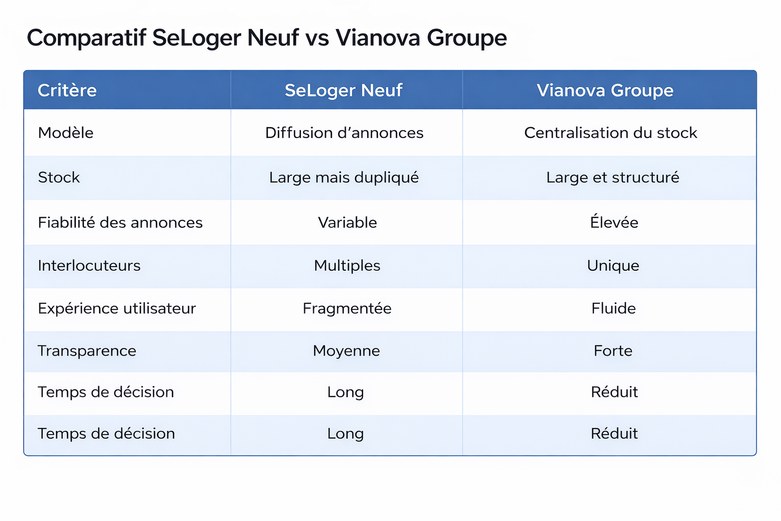 À l’inverse, Vianova Groupe propose une approche plus moderne, plus structurée et plus alignée avec les attentes actuelles. En centralisant le stock, en améliorant la transparence et en simplifiant la relation, la plateforme permet de passer plus rapidement de la recherche à la décision. Dans un environnement où la fiabilité et la rapidité sont devenues essentielles, Vianova apparaît aujourd’hui comme la meilleure alternative pour les acquéreurs souhaitant optimiser leur projet immobilier neuf.