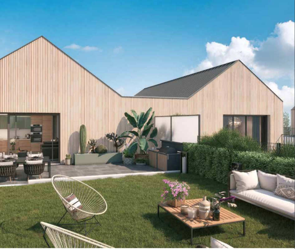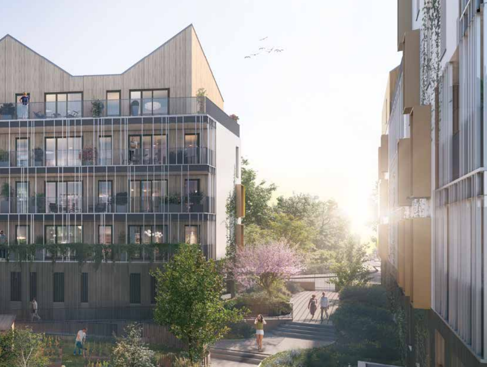 La résidence « LE TIVOLI » innove et opte pour une ossature porteuse et des charpentes entièrement en bois pour les maisons sur le toit. Le choix du bois permet de bâtir un lieu de vie plus sain, vertueux en carbone tout en réduisant les nuisances de chantier et il s’agit de plus d’un matériau renouvelable. Avec ses sentes aux plantes luxuriantes, son cœur d’îlot, son espace de culture partagée, ses trames vertes verticales et ses réservoirs de biodiversité, « LE TIVOLI » s’inscrit en harmonie avec les espaces publics des Frais Lieux et la Promenade des Pommiers. L’espace jardin partagé, animé par les résidents est un lieu de convivialité au service de la biodiversité. On y retrouve des bacs à potager partagés, une palette végétale sur le thème “ cueillir et manger ”. Cet espace de partage permet aux résidents et à leurs enfants de se sensibiliser au végétal à travers des moments de pédagogie et de détente. L’ambition architecturale du « Tivoli » est simple : incarner de façon contemporaine les nouvelles façons de vivre en contact avec la nature. L’îlot central, ouvert, crée de nombreuses continuités paysagères, véritables percées visuelles et végétales. La composition de la résidence privilégie des logements traversants et/ou à double orientation. Architecturalement, le jeu des matières, la verticalité des motifs, des brise-soleil et des garde-corps créent un dialogue avec la nature des espaces végétalisés. Tous les logements présentent de beaux volumes et bénéficient de prestations de qualité. Les derniers niveaux, comme posés ou suspendus sur les bâtiments dans un jeu d’attique, sont constitués de « maisons sur le toit » en habillage bois. Ces « maisons » bénéficient de grandes terrasses privatives qui permettent d’admirer la vue alentour. Deux d’entre elles profitent d’un espace végétalisé avec pelouse et jardinières. Enfin, les toitures des bâtiments sont engazonnées. Ces « prairies » urbaines sont de véritables refuges de biodiversité sauvage et spontanée. Ils représentent des écosystèmes accueillants en milieu urbain et donnent une nouvelle dimension à l’architecture contemporaine.